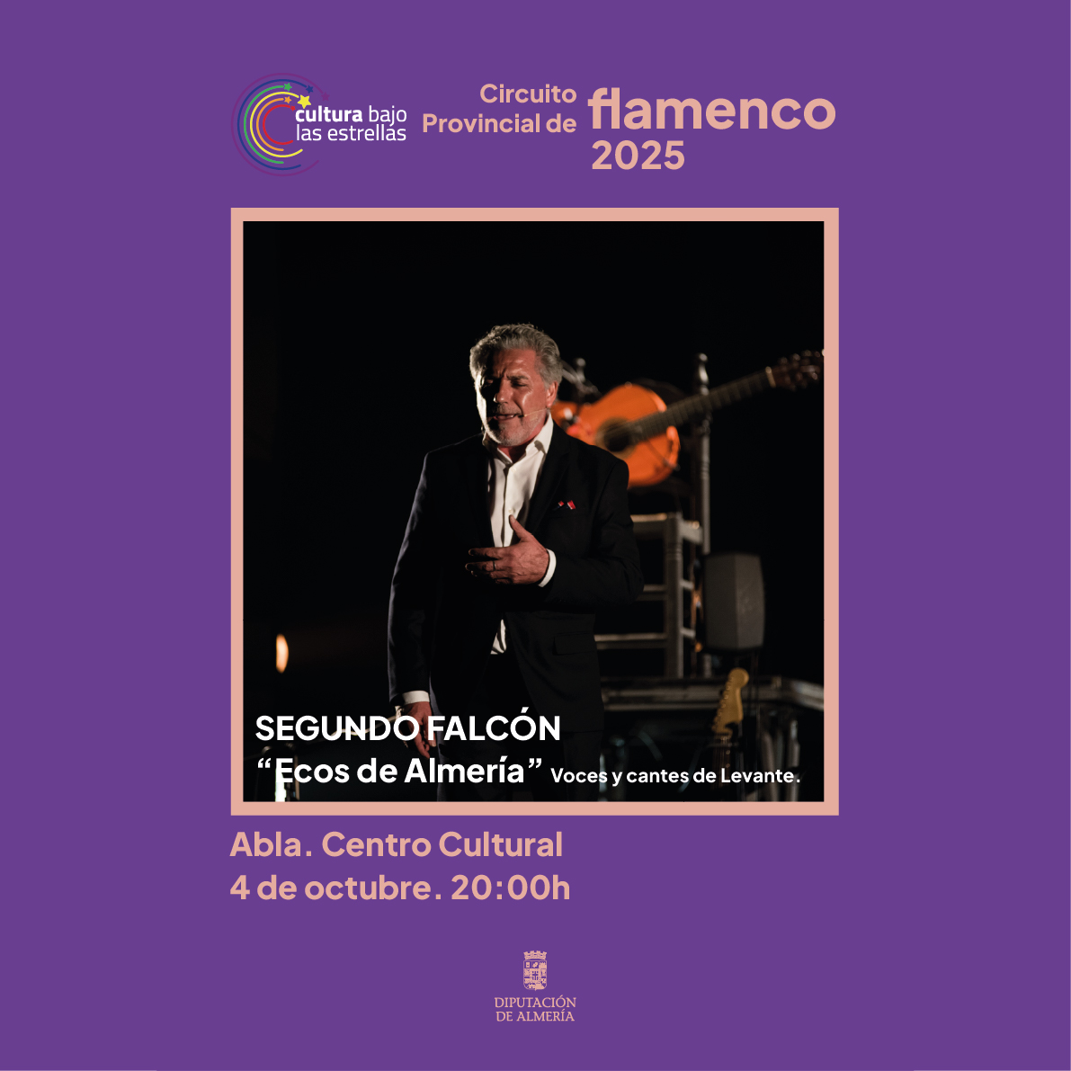 Este proyecto rinde homenaje a los grandes cantaores de Almería y a los cantes de levante, figuras legendarias de cantaores como El Ciego de la Playa o Pedro el Morato. El espectáculo explora los cantes mineros y de levante, la malagueña de Chacón, la soleá y los tarantos que cobran vida en un recorrido sonoro y visual por el alma del flamenco almeriense. La guitarra flamenca de David de La Fragua, fiel a las tonalidades y afinaciones tradicionales, acompaña a los cantes interpretados por Segundo Falcón. “Ecos de Almería” no solo rescata el legado de estos grandes maestros, sino que también reivindica la importancia de Almería en el desarrollo del flamenco, poniendo en valor su singularidad dentro de legado flamenco andaluz.