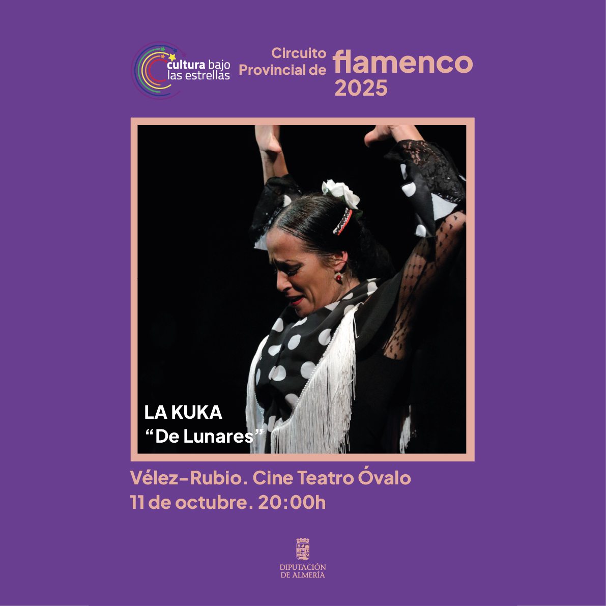 Es un espectáculo lleno de sentimiento y flamencura, respetando y apostando siempre por el flamenco tradicional, sin fusionar. La Kuka, bailaora Almeriense, es empaque, solera, pellizco y tronío, en la figura de una mujer que se deja la piel en escena a golpe de tacón, transmitiendo su pasión y elegancia en cada movimiento.